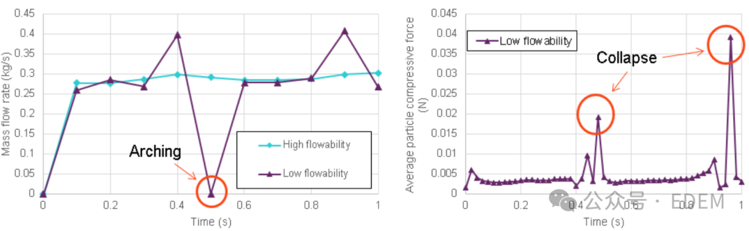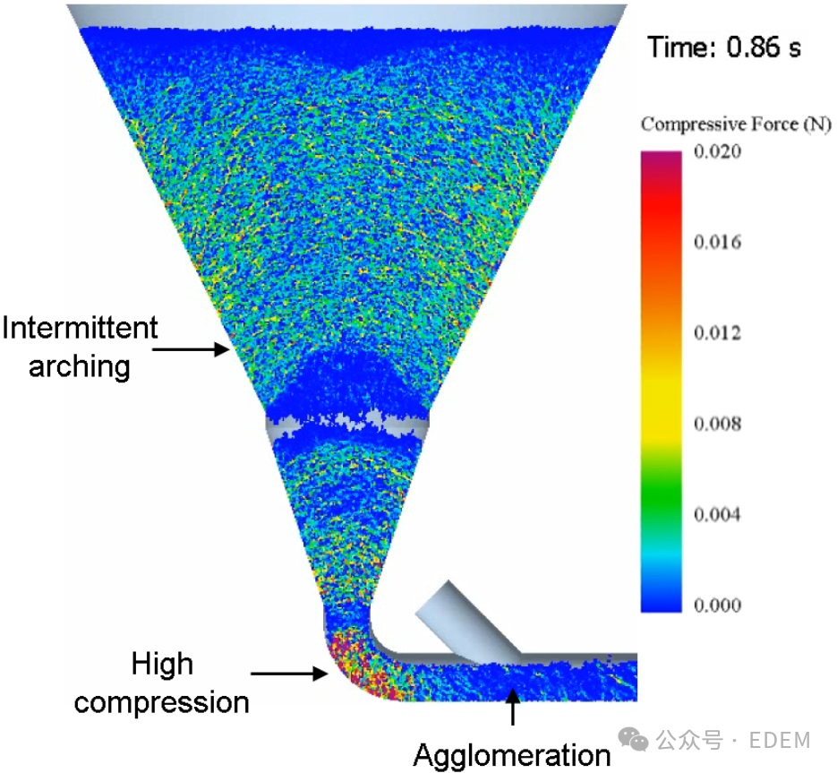 因此,在实际工艺操作中,简单地增加压降可能无法解决气力输送系统料仓供料过程流动性差甚至间歇结拱的问题。通过EDEM与CFD耦合,能够定量定性地考虑压降、固结应力和粉末流动性之间的关系,进一步改善工艺过程。