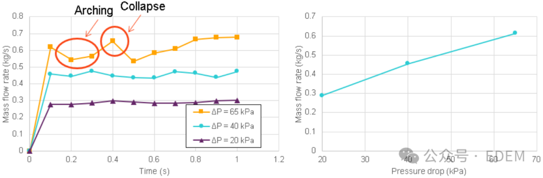 图5为仿真对比中流动性物料在20kPa、40kPa、65kPa压降下的供料质量流量曲线。