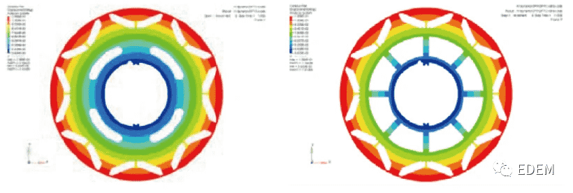 电机转子优化前(左)与优化后(右)的变形云图