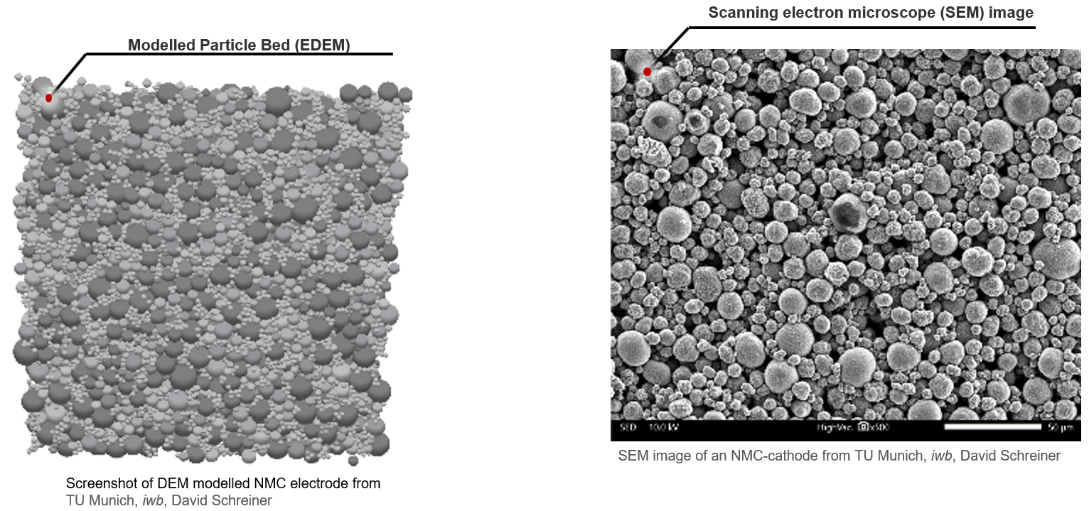 从扫描电子显微镜上观察一个真实阴极的图像,可以看到微观结构主要由球形粉末组成,EDEM不仅能够1:1复制这种微观结构,还提供了一系列物理特性来帮助描述材料在压实过程中的行为。
