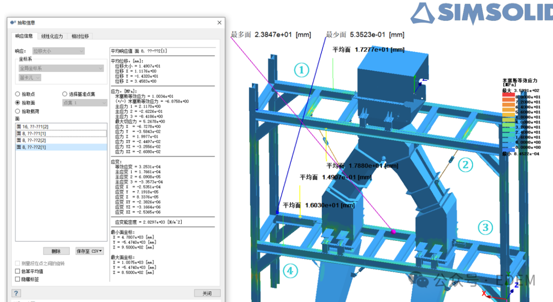例:查看四条横梁上顶面的受力形变情况,左侧功能框可以导出CSV表格。• 横梁两端是形变量最大的位置,但应力却很小。说明横梁搭接处的刚度不够,应加强横梁支撑柱的刚度和支撑柱与横梁连接的强度,加大支撑柱规格以及增设筋板;• 横梁中部是头部漏斗安装处,受头部漏斗的载荷,应力和形变都很大:可以增加肋板提高该处结构的刚度;• 横梁的螺栓过孔,孔周围,向外侧的应力较大,向内侧的应力小:此处可以均布螺栓孔。在中间适当增加螺栓。
