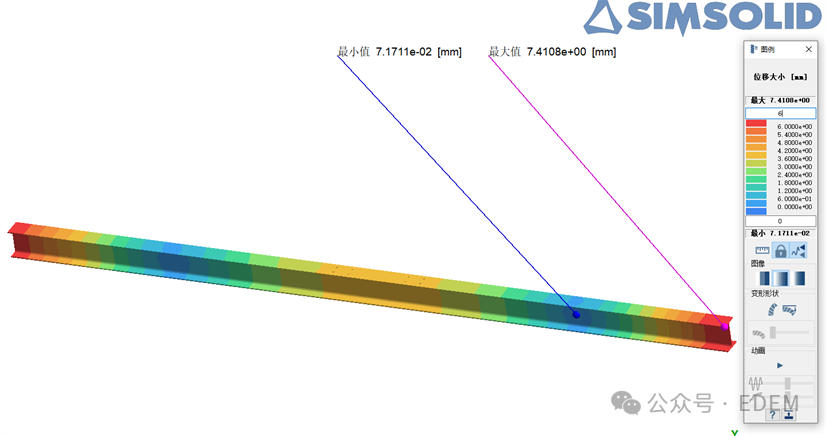 工作载荷也称运行载荷,是常规的设计计算内容,用于确定结构长期受力情况。首先将正常运料10秒期间转运站受到的平均作用力导入至SimSolid软件进行仿真,完成计算后,可以快速查看结构的位移、应力、应变等数据情况。
