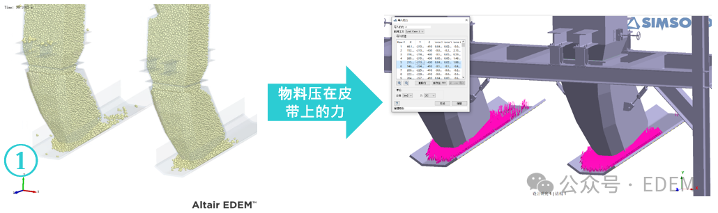 本章节涉及一个皮带机相关的载荷——皮带最大拉力。一般指的是出料皮带,在堵料且停机的情况下,带料启动需要的拉力,是设计皮带机功率需要的重要指标。本方案将计算克服仓压所需的皮带拉力。• 首先在EDEM中完成堵料工况仿真,静置一段时间直至物料稳定,导出物料压在皮带上的力,加载到SimSolid软件中;