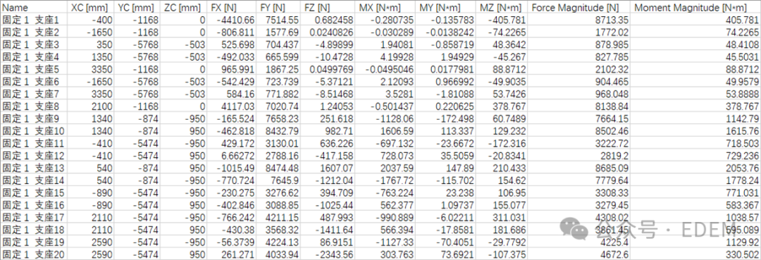 左侧浮窗中会列出所有类型约束的支反力,支反力以零件为单位区分,所以约束可以同时设置。为方便区分,建议给支座零件命名。支座信息关联到零件名字,单选可以查看。功能栏可以导出支反力和力矩的CSV表格。表格中包含各向力和力矩的数值,可用于埋件设计,或钢结构的计算书输入值。